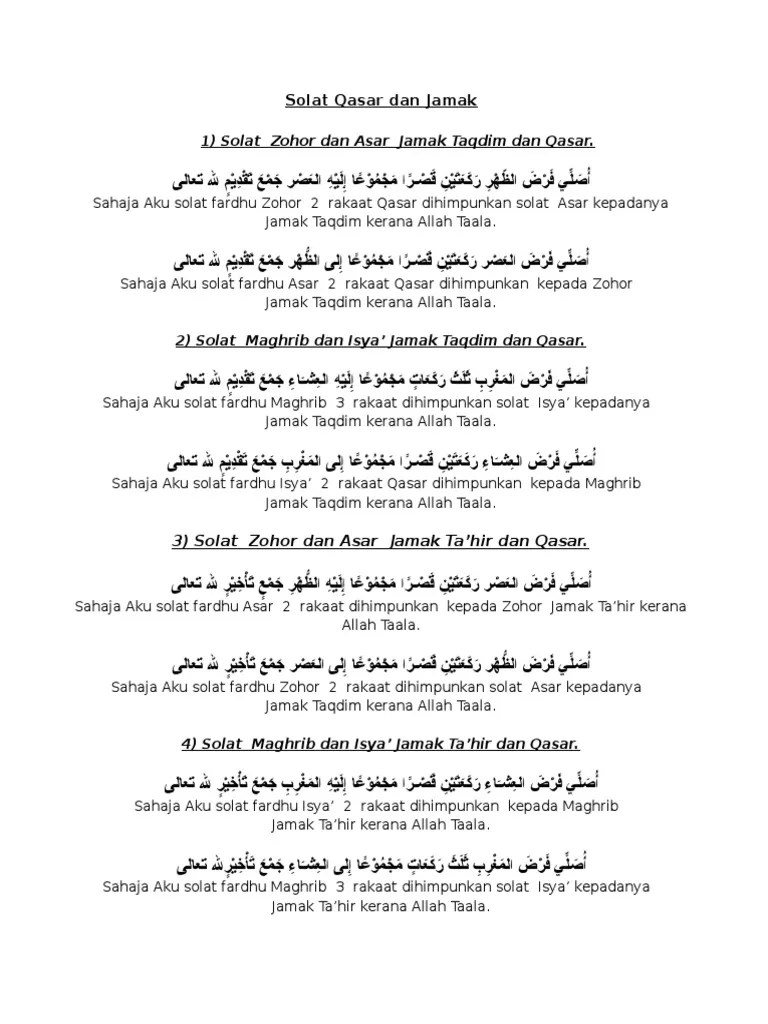 Lafaz niat solat jamak takdim bagi solat zohor adalah seperti berikut:. Solat jamak zohor dan asar. Lafaz niat jamak taqdim (zohor & asar). Cara solat jamak takhir zohor dan asar adalah.